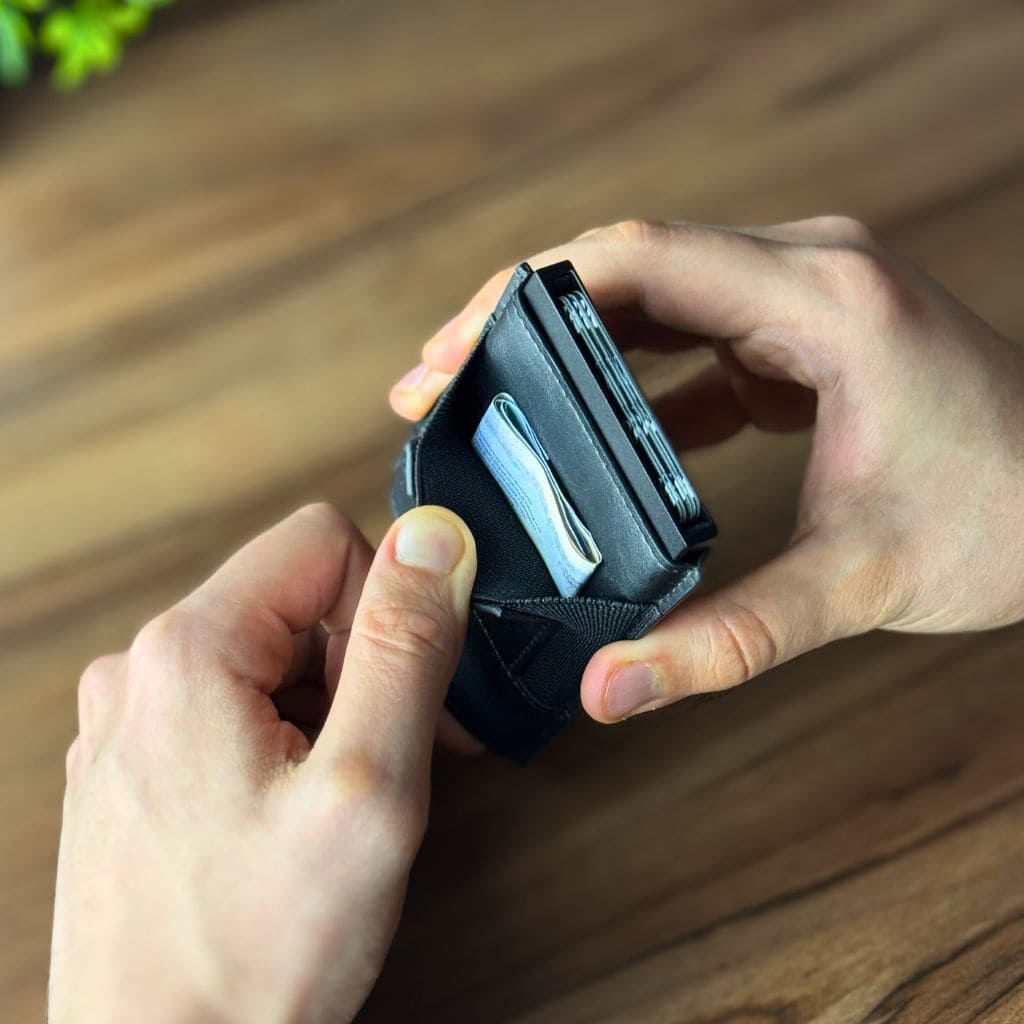 Nuestro tarjetero cuenta con un mecanismo que asegura tus tarjetas para evitar que estas se salgan aunque voltes la cartera. El mecanismo de nuestro tarjetero garantiza la seguridad de tus tarjetas en todo momento